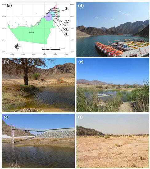 Map of UAE with sampled sites (a) and photos of the sites on 28 October 2019: (b) locality 1: Kholaiban Dam Masfut 1; (c) locality 2: Kholaiban Dam Masfut 2; (d) locality 5: Hatta Dam; (e) locality 6: Sheikh Maktoum Bin Rashid Al Maktoum Dam; (f) locality 4: Al Shuwaib Dam, dried at time of sediment collection.