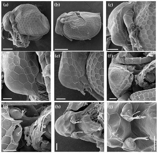Head (Figure 2b–d and Figure 3c–e) small, with a prominent beak-like “rostrum”(which is probably not homologous to the rostrum of Daphnia, see [49]) and a voluminous ocular dome surrounding a large compound eye (Figure 2b–d and Figure 3d–g). Minute ocellus rounded or slightly elongated, located near base of antenna I. Frontal head pore not found (Figure 3h,i). Dorsal head pore absent (Figure 2a,b). Labrum (Figure 2e) with a wide, fleshy main body and a large, setulated distal labral plate.