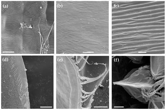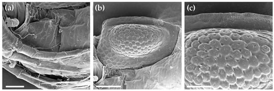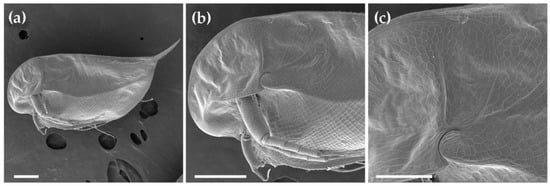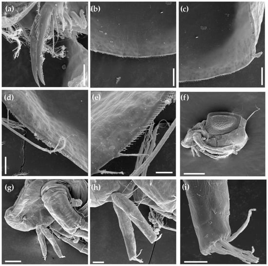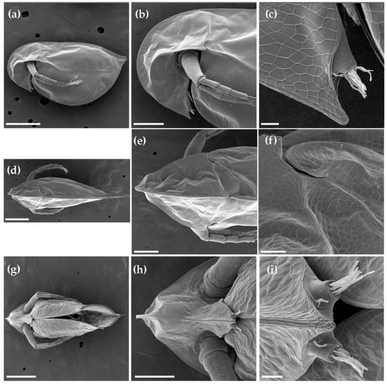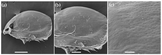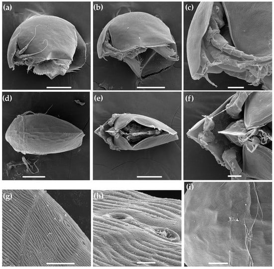 Valve (Figure 2f–i and Figure 4a) large, almost rounded, with a prominent polygonal ornamentation on the outer surface (Figure 2i, Figure 3a–f and Figure 4b). From inner side, ventral margin with a series of relatively long setae, covered by fine setulae (Figure 2h). Posteriorly, this row fluently turns to a series of setulae (Figure 2g,h and Figure 4a).