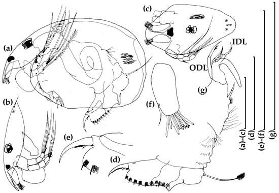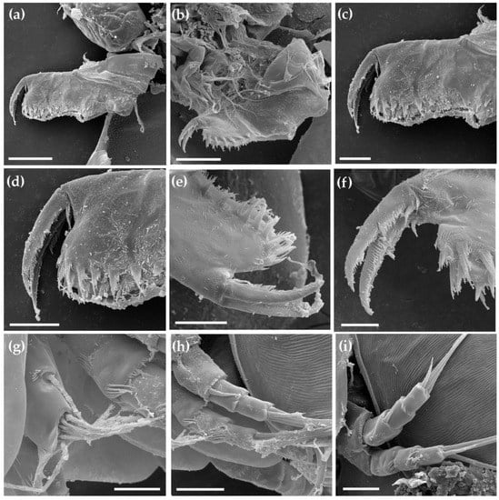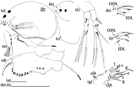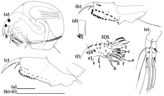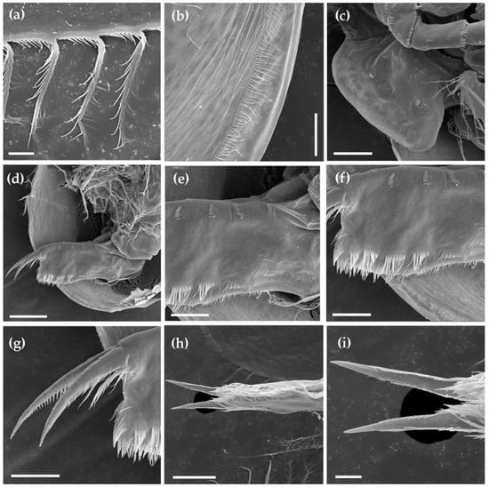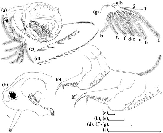 Limb I (Figure 7g) with elongated, narrow corm; inner distal lobe (or endite 5 sensu Kotov [49]) with a single anterior seta (Figure 7g: 1), bearing short setulae, and two soft setae (Figure 7g: a,b). Armature of posterior soft setae similar in all limbs: both segments provided with fine, long setulae. Endite 4 with single, relatively short anterior seta, and single posterior seta (Figure 7g: 2, c). Endites 3 with 2 posterior setae, without anterior setae (Figure 7g: d,e). Endites 2 with 3 posterior setae (Figure 7g: f–h). Two ejector hooks of remarkably different sizes. No maxillar process (or endite 1 sensu Kotov [49]) on limb base.