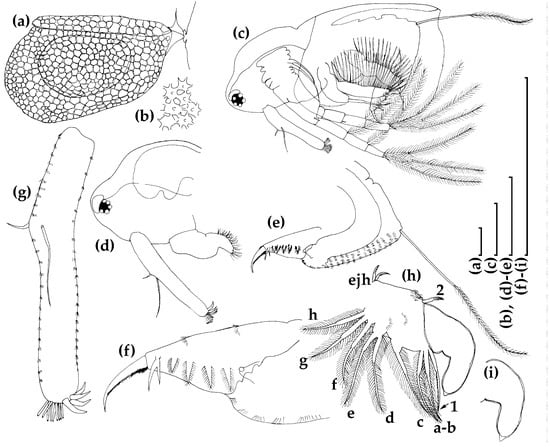 Antenna I thin (length approximately equal to six diameters of antennular body base), long, slightly curved (Figure 7b); surface covered by numerous fine, long setae and rows of minute denticles (Figure 8g,h). Antennular sensory seta slender, arising almost at middle of antennular body; nine short aesthetascs almost subequal in size (Figure 9i).