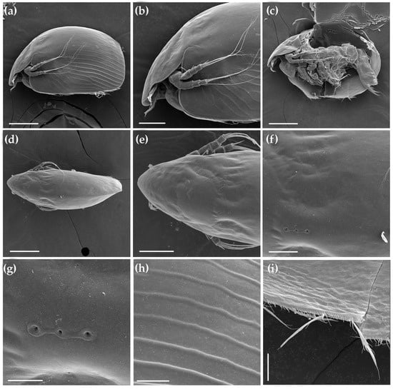 Parthenogenetic female. In lateral view, body rounded, typical of the genus; body height/length = 0.68, maximum height in middle (Figure 2a and Figure 3a,b). Dorsum of valves broadly convex, with prominent dorsolateral depression between head and the rest of body. Posterodorsal angle projected, but without a caudal needle. Ventral margin broadly rounded, smoothly passing to anteroventral margin. No integumental hairs on head and valves (Figure 3a–f). Body moderately compressed laterally, subovoid in dorsal or ventral view. Any lateral protuberances absent.