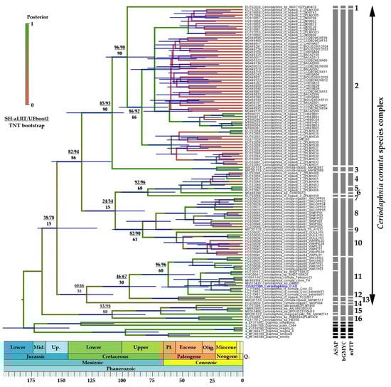 - Kapli, P.; Lutteropp, S.; Zhang, J.; Kobert, K.; Pavlidis, P.; Stamatakis, A.; Flouri, T. Multi-rate Poisson tree processes for single-locus species delimitation under maximum likelihood and Markov chain Monte Carlo. Bioinformatics 2017, 33, 1630–1638. [Google Scholar] [CrossRef]