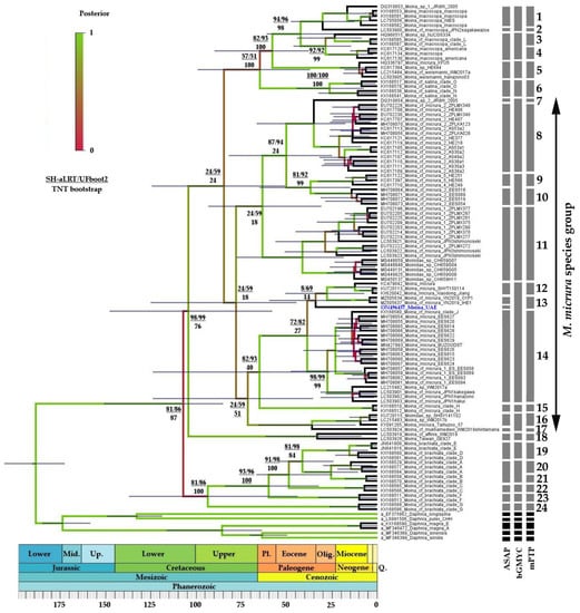 As a prior outgroup, we used sequences of Daphnia published by Cornetti et al. [67]. The effectiveness of the MCMC runs, taking into consideration the estimations of the effective size (ESS) for all parameters higher than 200, was controlled in Tracer v.1.7 [68]. After unification of MCMC runs using LogCombiner (part of BEAST2), a consensus tree was obtained in TreeAnnotator (part of BEAST2) with a burn-in rate 25%. Posterior probabilities were used as support values, following the recommendations from [69]. As the main clades for all trees were congruent, we presented the ultrametric BI trees, with branch support for key nodes.