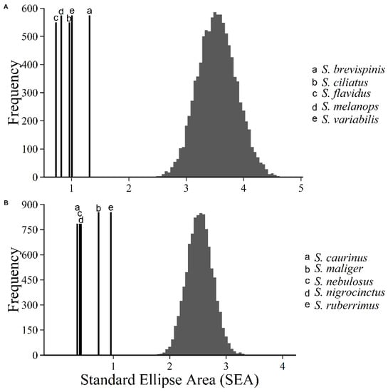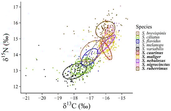 - Jackson, A.L.; Inger, R.; Parnell, A.C.; Bearhop, S. Comparing Isotopic Niche Widths among and within Communities: SIBER—Stable Isotope Bayesian Ellipses in R: Bayesian Isotopic Niche Metrics. J. Anim. Ecol. 2011, 80, 595–602. [Google Scholar] [CrossRef]