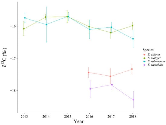 Extrinsic sources of variation in trophic niche, such as year-to-year variation and intrinsic sources of variation such as size-varying or ontogenetic changes in diet could increase the size and overlap of observed niches. If extrinsic and intrinsic sources of variation are large, we might erroneously conclude that niches are relatively large and exhibit high overlap and thus conform more closely to a stochastic model of species coexistence. However, even though we identified both year-to-year variation (Figure 6 and Figure 7), and size-based variation in our data (Figure 8 and Figure 9), neither of those effects were sufficient to create large niches that would conform to those we observed in the null model (i.e., stochastic model). We found that δ13C varied by less than 0.5‰ and δ15N varied by less than 1‰ among years, and similarly, the largest ontogenetic change in δ15N was by S. brevispinis which changed by approximately 1.5‰. This ontogenetic change in S. brevispinis probably contributed to the relatively large niche size observed for this species, but we note that resulting cumulative overlap for this species was still relatively low at 121% compared to that expected from a lottery-type model. Additionally, the size range of the fish that are sampled directly affects the ontogenetic shift that is observed. We sampled 80% of the size range of S. brevispinis, 55% of the size range of S. maliger, and 87% of the size range of S. ruberrimus [14,40]. We sampled 50% of the entire size range for S. ciliatus, S. flavidus, and S. variabilis. Size at maturity has not been published for S. nigrocinctus. We suggest that when using niche characteristics to differentiate between different models of community composition and species coexistence, it is important to quantify potential sources of variation in the measured niche metrics that might inflate estimates.