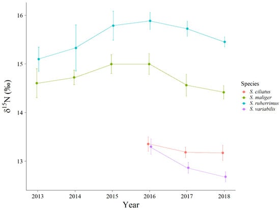 Sebastes ruberrimus and S. maliger were significantly different in δ13C values across years (Table 4). There was not a significant difference among years for S. ciliatus or S. variabilis in δ13C (Table 4, Figure 6). Sebastes ruberrimus, S. ciliatus, and S. variabilis were significantly different in the δ15N values across years (Table 5). Sebastes maliger was not significantly different in δ15N across years (Table 5, Figure 7).