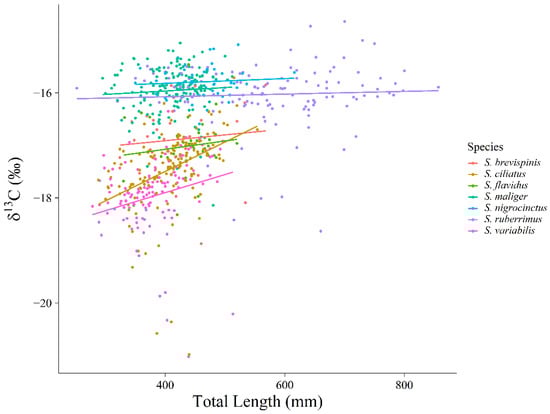 Sebastes ciliatus (R2 = 0.1488, F1, 148 = 27.05, p = 6.5 × 10−7) and S. variabilis (R2 = 0.04698, F1,130 = 7.458, p = 0.00126) exhibited increased enrichment of δ13C with increasing total length. None of the other species exhibited a significant relationship between δ13C and total length (Figure 8).