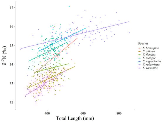 Sebastes flavidus was the only species of rockfish that did not have a significant δ15N relationship with total length. Sebastes brevispinis (R2 = 0.5252, F1,27 = 31.97, p = 0.00138), S. ciliatus (R2 = 0.2127, F1, 148 = 41.27, p = 0.00068), S. maliger (R2 = 0.1384, F1, 155 = 26.05, p = 9.6 × 10−7), S. nigrocinctus (R2 = 0.2002, F1, 44 = 12.26, p = 0.00132), and S. variabilis (R2 = 0.3502, F1, 130 = 71.61, p = 0.00107) did not differ significantly by slope (Figure 9). Sebastes brevispinis, S. ciliatus, and S. variabilis had a slope of δ15N with length that was more than twice as large as the slope for S. ruberrimus (R2 = 0.2982, F1, 124 = 54.12, p = 2.26 × 10−11), but S. ruberrimus did not differ significantly from S. maliger and S. nigrocinctus in slope (Figure 9).