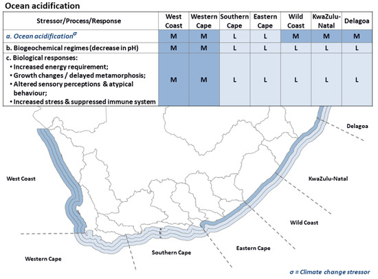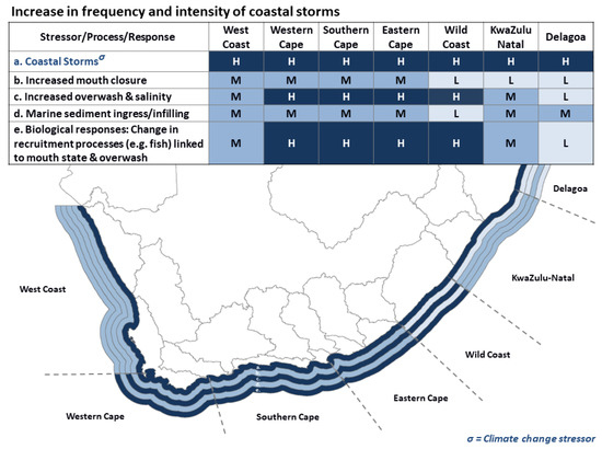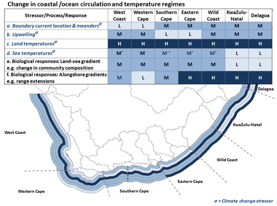 The higher coastal temperatures expected for the south coast, therefore, may result in an eastward extension of the subtropical climatic zone (Table 2), compacting the warm temperate climatic region against the cooling southern Benguela region, and expanding the cool temperate climatic region [195,196]. These marked geographical shifts in alongshore temperature gradients are expected to have marked effects on nearshore and estuarine biota, especially along the Eastern Cape, Wild Coast, and KwaZulu-Natal regions (indicated by the high rating in Figure 3).