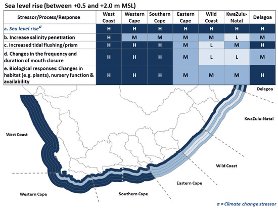 Although increased sea storms will contribute to increased mouth closures in the West Coast and Western Cape regions, changes from the present may not be that high, as a number of the smaller arid systems in these regions are predominantly closed (due to a lack of inflow), while the large permanently open systems, Olifants and Great Berg estuaries, should remain open as a result of significant tidal flows as indicated by medium rating in Figure 5 [29]. While the steeper beach slopes along the West Coast region are likely to buffer against a significant increase in overwash and associated increases in salinity (medium ranking in Figure 5), such events are very likely to increase salinity in more sheltered systems with lower berms in the Western Cape Region (high ranking in Figure 5). The average berm height, which is estimated between 2.0 and 3.5 m mean sea level (MSL) in this region, with a gradient that runs from north to south, can increase by 0.5 to 1.0 m where sufficient sediment is available as a result of increased sediment transport potential.