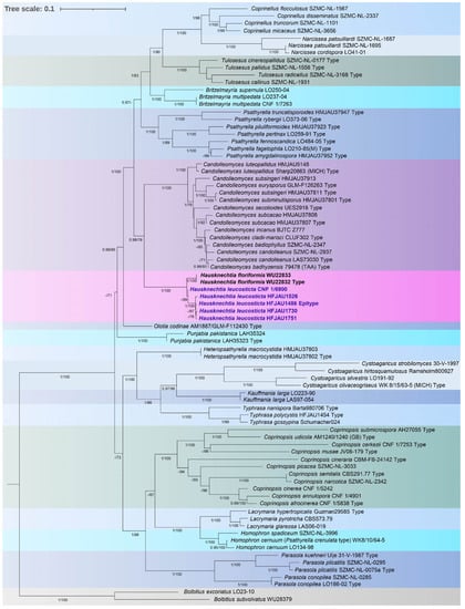 A total of 27 sequences from seven Hausknechtia specimens (five H. leucosticta and two H. floriformis) were newly generated in this study. Sequence identity analysis between H. floriformis WU22832 (holotype) and H. floriformis WU22833 (paratype) revealed 100% identity for each of the four gene regions. Based on the BLAST results, H. leucosticta (five collections) shared identity with H. floriformis (newly generated sequences) of 97.67–97.95% for ITS, 99.40–99.78% for LSU, 95.22–97.29% for tef-1α, and 95.83–96.69% for β-tubulin gene region. A total of 17 branches (BI-PP ≥ 0.95, ML-BP ≥ 70), representing 17 genera within the family Psathyrellaceae, are formed in the phylogenetic tree (Figure 1). The two well supported lineages (BI-PP = 0.98, ML-BP = 79), corresponding to the genera Hausknechtia and Candolleomyces, were recovered as a monophyletic group. At the species level, H. leucosticta formed a distinct lineage separated from H. floriformis with high support (BI-PP = 1, ML-BP = 100).