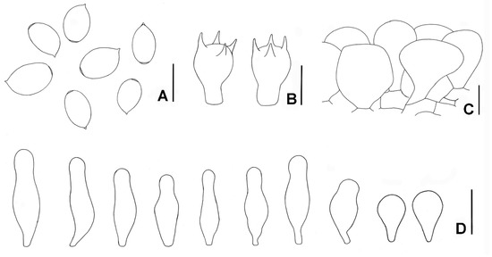 Hausknechtia leucosticta. (A) Basidiospores. (B) Basidia. (C) Pileipellis. (D) Cheilocystidia. Bars: (A–C) = 10 µm, (D) = 20 μm.