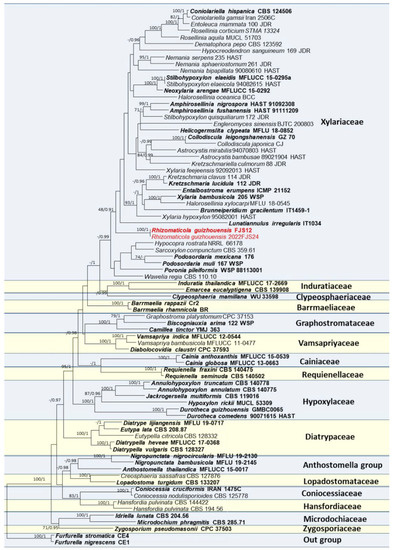 - Samarakoon, M.C.; Hyde, K.D.; Maharachchikumbura, S.S.N.; Stadler, M.; Jones, E.B.G.; Promputtha, I.; Suwannarach, N.; Camporesi, E.; Bulgakov, T.S.; Liu, J.K. Taxonomy, phylogeny, molecular dating and ancestral state reconstruction of Xylariomycetidae (Sordariomycetes). Fungal Divers. 2022, 112, 1–88. [Google Scholar] [CrossRef]