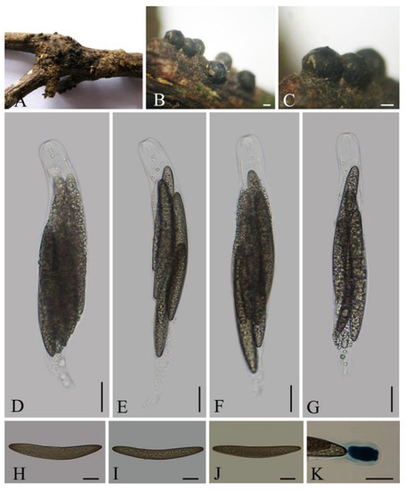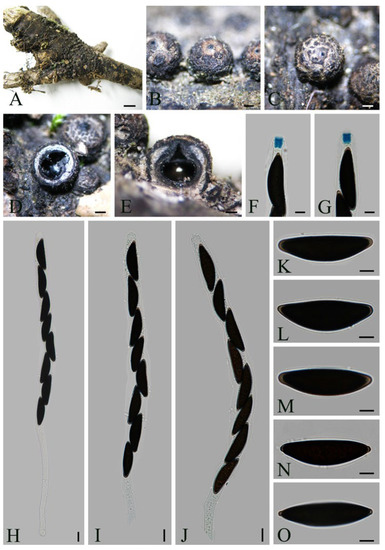 - Senanayake, I.C.; Maharachchikumbura, S.; Hyde, K.D.; Bhat, J.D.; Jones, E.B.G.; McKenzie, E.H.C.; Dai, D.Q.; Daranagama, D.A.; Dayarathne, M.C.; Goonasekara, I.D.; et al. Towards unraveling relationships in Xylariomycetidae (Sordariomycetes). Fungal Divers. 2015, 73, 73–144. [Google Scholar] [CrossRef]