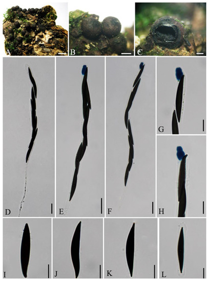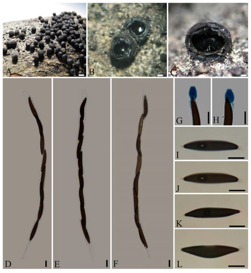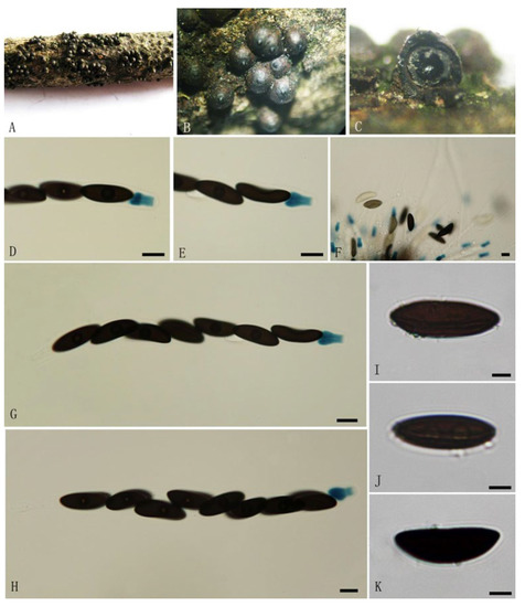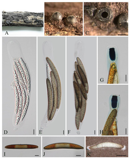 Samples with black dots were collected from forests in China and Thailand in the rainy season. Samples were put into paper bags with some silica gel desiccant. Macroscopic characteristics of stromata were observed and photographed under an Olympus SZ61 stereomicroscope. Materials were mounted in water and Melzer’s reagent for anatomical examination [31]. Macroscopic photographs of asci and ascospores were taken under a Nikon digital camera (700 D) fitted to a light microscope (Nikon Ni, Nikon Corporation, Tokyo, Japan). At least 30 ascospores and 30 asci were measured using the Tarosoft ® image framework (v. 0.9.0.7). Macroscopic photographs were made with the necessary changes and arranged for a plate. Single-spore isolation was used to obtain pure cultures [33]. Herbarium materials were deposited in the Herbarium of Guizhou Agricultural College (GACP); the Herbarium of the Engineering and Research Center for Southwest Bio-Pharmaceutical Resources of National Education Ministry of China, Guizhou University (GZUH); the Herbarium of Mae Fah Luang University (MFLU); and the living cultures are deposited in Guizhou University Culture Collection (GZUHC) or Mae Fah Luang University Culture Collection (MFLUCC).