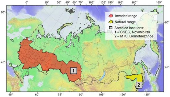 The studied localities in the Russian Far East and in western Siberia. MTS—the botanical garden of the Mountain-Taiga Station, Gornotaezhnoe, Ussuriysk District, Primorskiy Territory; CSBG—the Central Siberian Botanical Garden, Novosibirsk.