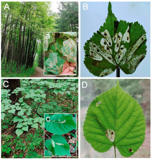The studied biotopes in Siberia (A,B) and the Russian Far East (C,D). The grove of Tilia cordata (A) with the foci of Phyllonorycter issikii and numerous mines on the leaves (a,B) in the forest park zone adjacent to the Central Siberian Botanical Garden (Novosibirsk). Tilia amurensis in the undergrowth of a mixed forest predominated by Mongolian oak Quercus mongolica (C), with rare Ph. issikii mines (c,D) around the Mountain-Taiga Station (Gornotaezhnoe, Ussuriysk District, Primorskiy Territory).
