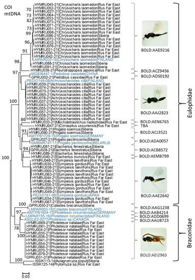 Maximum likelihood tree showing the relatedness of hymenopteran parasitoids grown from larvae and pupae of Phyllonorycter issikii in Asian Russia in 2020–2021, with closest neighbors in BOLD (borrowed sequences are indicated in blue). Each specimen is indicated by the BOLD process ID (begins with HYMRU or GPRU), followed by species name, country or macroregion (Siberia, Rus Far East = Russian Far East). Bootstrap values > 70 are indicated next to the corresponding branches. BIN numbers are given next to each cluster. The images of adults are provided for most frequently recorded species.