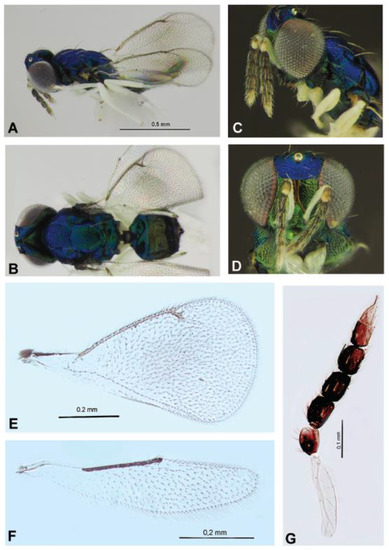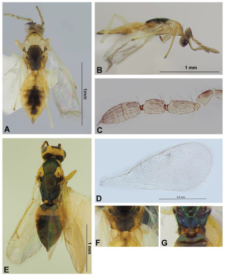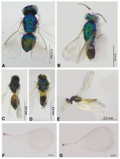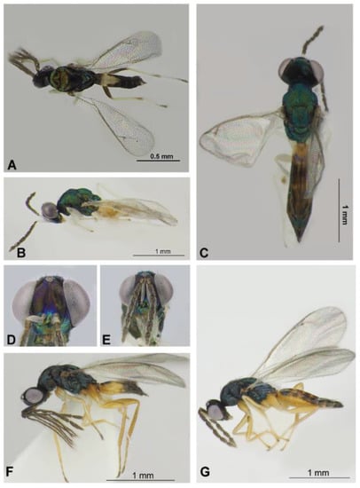 Eulophinae (females, males): Sympiesis gordius (Walker, 1839) (male) (A), Sympiesis laevifrons Kamijo, 1965 (female) (B–E), Pnigalio soemius (Walker, 1839) (male and female) (F,G). Habitus in dorsal view (A,C) and lateral view (B,F,G), face and antennae in frontal view (D,E).