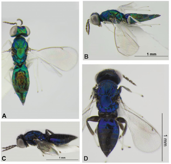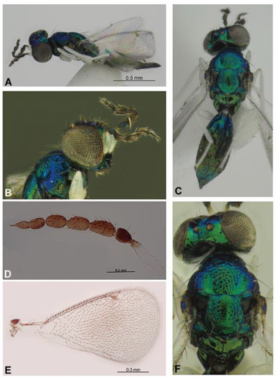 - Bouček, Z. Australasian Chalcidoidea (Hymenoptera). A Biosystematic Revision of Genera of Fourteen Families, with a Reclassification of Species; CAB International: Wallingford, Oxon, UK; Cambrian News Ltd.: Aberystwyth, Wales, 1988; pp. 584–832. [Google Scholar]