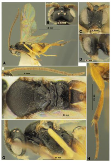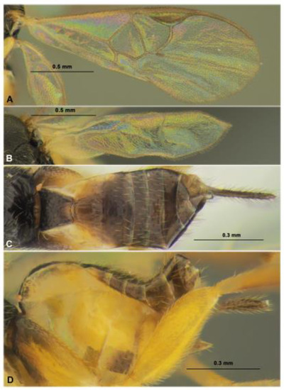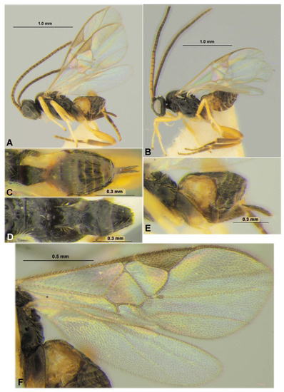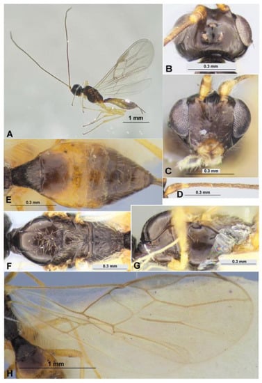 - Tobias, V.I.; Belokobylskij, S.A.; Kotenko, A.G. Family Braconidae. In Key to Insects of the USSR European Part. Hymenoptera; Medvedev, G.S., Ed.; Nauka: Leningrad, Russia, 1986; Volume 3, Part 4; pp. 3–500. (In Russian) [Google Scholar]