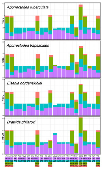 In the 15 new mitogenomes, there was a large difference in the PCG length between families, a little difference between species and no difference within species. The lengths of the PCGs of the lumbricids A. tuberculata, A. trapezoides and E. nordenskioldi were 11,116 bp, 11,110 bp and 11,114 bp, respectively; that of the moniligastrid D. ghilarovi was 11,134 bp. The PCGs of the four earthworm species exhibited similar initiation and termination codons (Tables S3 and S4). All of the initiation codons of the four earthworms were ATG. Most of the termination codons were TAR, and atp8, cox1, cox3, nd2 and nd4l in all four species, nd1 in Aporrectodea, nd6 in E. nordenskioldi and nd4 in D. ghilarovi were incomplete stop codon T or TA (Tables S3 and S4). These truncated stop codons are commonly used in mitogenomes in Metazoa, and are modified to a complete stop codon by the post-transcriptional poly-adenylation [58]. The RSCU values of the four earthworm species are shown in Figure 3. The codons CGA-Arg and UCU/A-Ser2 in the four earthworm species and the UUA-Leu2 in D. ghilarovi were the most common.