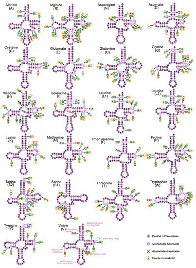 The secondary structures of 22 tRNAs of the 3 lumbricids, A. tuberculata (OL840316), A. trapezoides (OM687887) and E. nordenskioldi (OL840314) are illustrated in Figure 4. All of the tRNAs can fold as a typical cloverleaf structure, except the trnA, trnG and trnV whose lack the TψC loop and trnS1 which lacks the DHU stem. Figure 5 shows the secondary structures of the tRNAs of the moniligastrid D. ghilarovi: trnN, trnD, trnG, trnK, trnT, trnY and trnV lack the TψC loop, and trnS1 lacks the DHU loop. In addition, the identified wobble GT base pairs and unmatched base pairs AA, CA, CT and TT in different tRNA stems are shown in Figure 4 and Figure 5, and they might be restored during the post-transcriptional editing processes [59].