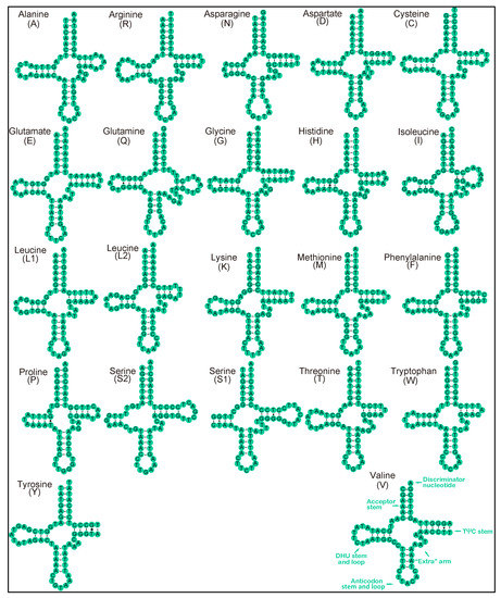 Predicted secondary structure for the tRNAs of D. ghilarovi. The tRNAs are labeled with the abbreviations of their corresponding amino acids. Dashes indicate the Watson–Crick base pairs, dots indicate the wobble GT pairs and gaps indicate non-match bases.