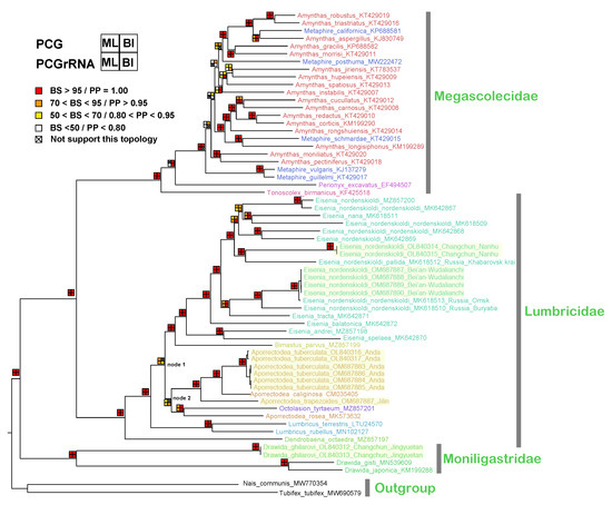 Phylogenetic trees of earthworm using mitogenome data. The four squares near the node indicate the support value: top left, ML of PCG; bottom left, ML of PCGrRNA; top right, BI of PCG; bottom right, BI of PCGrRNA. The newly sequenced mitogenomes are highlighted, and genera delimited by the current taxonomic base are distinguished from each other by a particular color.