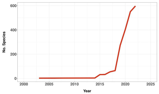 As of 21 July 2022, 597 species of fungi are included in the Red List (e.g., Figure 1, Box 1). The first fungal species were added to the Red List in 2003 (two lichenized species), but it was not until 2015 that efforts began to accelerate, with most species added in the last three years (Figure 2).