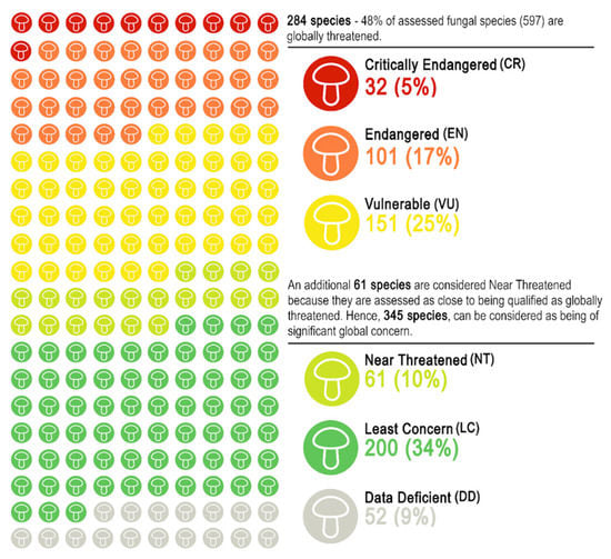 A total of 345 (58%) assessed fungal species are listed at a threat category or NT [24] of which 284 (48%) are threatened (Figure 3). Among these, 32 (5%) are CR, 101 (17%) are EN, 151 (25%) are VU, and 61 (10%) are NT. The remaining published species are listed as DD (52, 9%) or LC (200, 34%).