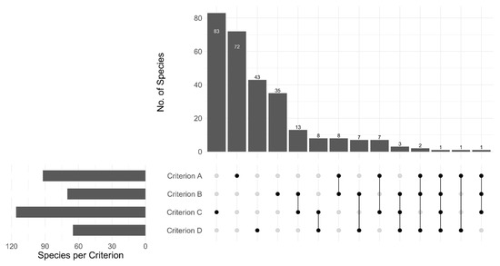Criteria used in global assessments of threatened fungi in the Red List (n = 284) showing the frequency with which individual criterion (dots) and combinations of criteria (dots joined by vertical lines) were utilized. Criterion A is related to population size reduction, criterion B to restricted geographic range, criterion C to small population size and decline, and criterion D to very small or restricted population and distribution range.
