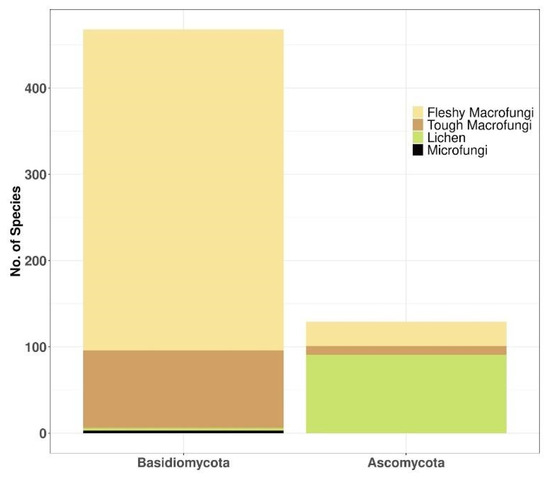 In total, there are 94 lichens (16%). The most prevalent growth form among other species, representing more than half of all species (62%), is Basidiomycota-fleshy macrofungi (372) of which most are agarics (228) or boletes (67). The other growth forms are Ascomycota-fleshy macrofungi (28), Ascomycota-tough macrofungi (10), Basidiomycota-microfungus (3, all of which are smut fungi), and Basidiomycota-tough macrofungi (90), with the most prevalent being polypores (45).