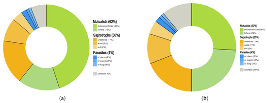 Proportion of different trophic guilds for (a) all assessed fungi (n = 597) and (b) threatened species in the July 2022 Red List update (n = 284).