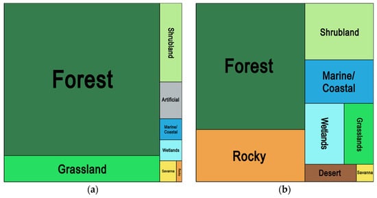 The IUCN (International Union for Conservation of Nature) Red List of Threatened Species™ (henceforth Red List) is a global list of species and their conservation status, along with associated information regarding species distribution, habitat, ecology, population size, trends, structure, threats, and conservation [19]. The Red List is an important resource to support concrete conservation policy, planning, and action. It helps authorities delimit protected areas, guides funding allocation and influences development decisions [20]. It has also been used as an indicator to measure and monitor the state of global biodiversity for different global framework targets, such as Aichi Target 12 and Sustainable Development Goal 15, and will likely be used for the Post-2020 Global Biodiversity Framework [21,22,23]. The Red List is divided into categories according to the degree of threat to which a species is subject. The categories range from Least Concern (LC) to Extinct (EX), with three “threatened” categories: Vulnerable (VU), Endangered (EN), and Critically Endangered (CR), in addition to a Near Threatened category (NT). The Data Deficient (DD) category includes species for which there is not enough information to make an assessment of their extinction risk [19]. The assessment of the degree of threat is carried out using five defined criteria that can be routinely applied. The criteria (A-E and their subcriteria) are based on population size, structure, and trends as well as geographic distribution, allowing for comparison and reproducibility across taxonomic groups [19].