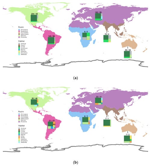 Number of assessed species/threatened species in different biogeographic realms for (a) nonlichenized fungi and (b) lichens. The boxes illustrate the corresponding habitat occupied by these species. Note that species may be present in more than one habitat. Oceania and Antarctica were excluded from the maps.