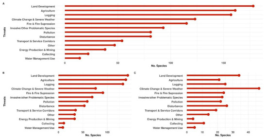 The most frequently listed threats to threatened and NT species were residential and commercial development (178 species) followed by agriculture (161) and logging (157) (Figure 10A).