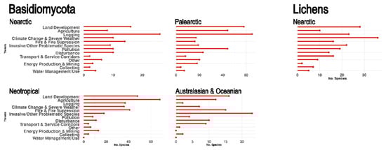 Threats identified for globally threatened and near-threatened Basidiomycota and lichens in the different biogeographic realms. This compilation was based on the qualitative listing of threats for each assessed species, and the relative size of the bars does not reflect the relative significance of each threat. NT species are included, as understanding their threats is needed to mitigate further population loss.