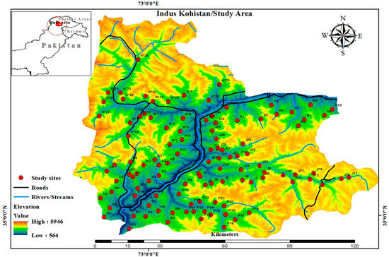 The current study was performed in Pakistan’s Himalayas and Hindukush ranges, specifically in Indus Kohistan (Figure 1). The Himalayan part of Pakistan comprises Chitral and Gilgit Baltistan; most of its northern peaks remain ice-capped, and the ranges of Kohistan are mostly sloping mountains and forest-covered valleys. Forests are present at specific elevations ranging from 3000 to 4000 m asl, and the land of grasses and dwarf shrubs is altered by human modification and overgrazing [43,44,45,46,47]. Indus Kohistan has three districts in the north of the Khyber Pakhtunkhwa province, with an area of 7656.91 sq. km.