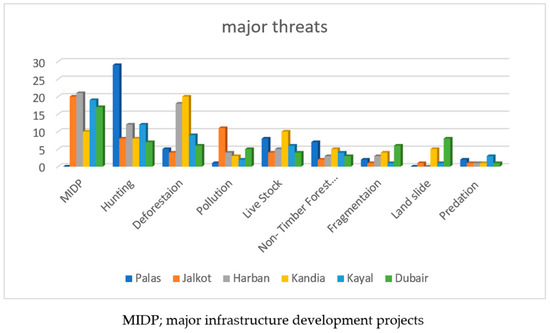 The pheasants faced human pressures and natural hazards throughout their natural habitats. The threats to the pheasants imposed by human activities included illegal hunting, major infrastructure development projects, deforestation, non-timber forest collection, fragmentation, excessive/immoderate life stocks, and pollution. Natural threats, such as landslides, diseases, and natural predations, ineffectually affect the populations of the pheasants and their habitats in all the valleys of the study area. The major threats that severely damage the populations and habitats of the concerned species include major infrastructure development projects, illegal hunting, and deforestation (Figure 2).