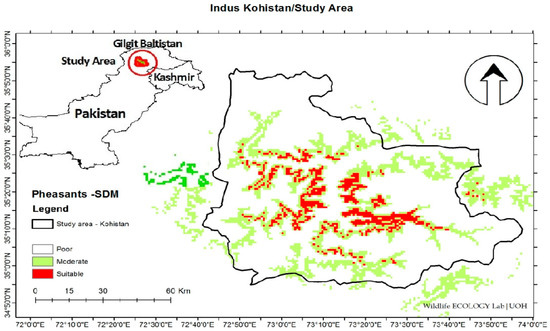 Species distribution modeling (MaxEnt) predicted suitable habitats for the pheasant species in the study area.