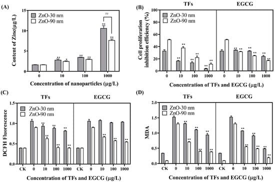 The detection of the zinc content in RTE cells induced with 30 nm ZnO-NPs and 90 nm ZnO-NPs for 12 h by ICP (A). Effects of 100 μg/L of ZnO-NPs with different sizes (30 nm and 90 nm) and the treatment with different concentrations of TFs and EGCG (10, 100, and 1000 μg/L) on the cell proliferation inhibition efficiency (B), and the generation of ROS (C), MDA (D) in RTE cells for 12 h. CK was blank group (the group with neither sample nor NPs treatment). The data was represented as the means ± standard deviation. The asterisks denoted responses that were significantly different from the 0 μg/L group (* p < 0.05, ** p < 0.01). Hash signs indicate significant differences between two selected groups (## p < 0.01).