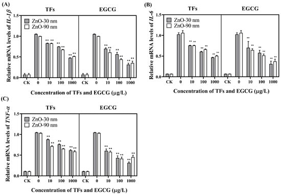 When the treatment with TFs or EGCG is conducted, the expression levels of interleukin 1β (IL-1β), interleukin 6 (IL-6), tumor necrosis factor-α (TNF-α) (Figure 2A–C), C-C motif chemokine 2 (CCL2), and C-X-C motif chemokine 8 (CXCL8) (Figure 3A,B) were significantly downregulated with increased concentrations of TFs or EGCG compared to the group exposed with ZnO-NPs only. As shown in Figure 2A–C, the expression of genes was most significantly downregulated after 1000 μg/L TFs or EGCG treatment.