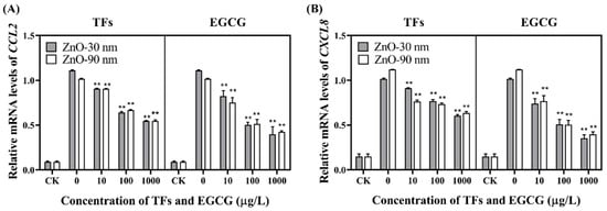 The relative gene expression of inflammatory cytokines CCL2 (A) and CXCL8 (B). Different concentrations of TFs and EGCG (10, 100, and 1000 μg/L) treatment after different sizes (30 nm and 90 nm) with 100 μg/L of ZnO-NPs exposure in RTE cells for 12 h. CK was blank group (the group with neither sample nor NPs treatment). The data was represented as the means ± standard deviation. The asterisks denoted responses that were significantly different from those of the 0 μg/L group (** p < 0.01).