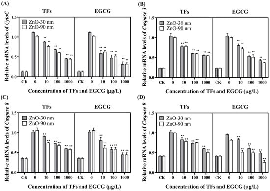 Apoptosis-related gene expression of CytoC (A), Caspase 3 (B), Caspase 8 (C), and Caspase 9 (D). Different concentrations of TFs and EGCG (10, 100, and 1000 μg/L) treatment after 100 μg/L of 30 nm or 90 nm ZnO-NPs exposure in RTE cells for 12 h. CK was blank group (the group with neither sample nor NPs treatment). The data was represented as the means ± standard deviation. The asterisks denoted responses that were significantly different from those of the 0 μg/L group (** p < 0.01).