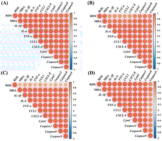 Correlation between oxidative stress indicators ROS, MDA, and inflammatory factors IL-1β, IL-6, TNF-α, CCL2, CXCL8, and CytoC, and mitochondrial apoptosis-related indicators Caspase 3, Caspase 8, and Caspase 9 in TFs-treated RTE cells exposed to ZnO-NPs-30 nm (A), ZnO-NPs-90 nm (B), EGCG-treated RTE cells exposed to ZnO-NPs-30 nm (C), and ZnO-NPs-90 nm (D).