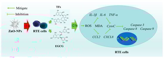 According to the correlation analysis, the alleviating effect of TFs or EGCG were mainly mediated by rescuing the intracellular redox balance by scavenging peroxyl radicals in RTE cells (Figure 5). Thus, the inflammatory response induced by oxidative stress was alleviated. When the inflammatory response was alleviated, the CytoC-induced mitochondrial apoptotic pathway was not activated at high levels, and abnormal RTE cell apoptosis was alleviated. Details about TFs and EGCG treatment mechanisms in mitigating the apoptosis of RTE cells induced by ZnO-NPs exposure are shown in Figure 6.