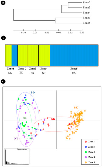 - Rosenberg, N.A. DISTRUCT: A program for the graphical display of population structure. Mol. Ecol. Notes 2004, 4, 137–138. [Google Scholar] [CrossRef]