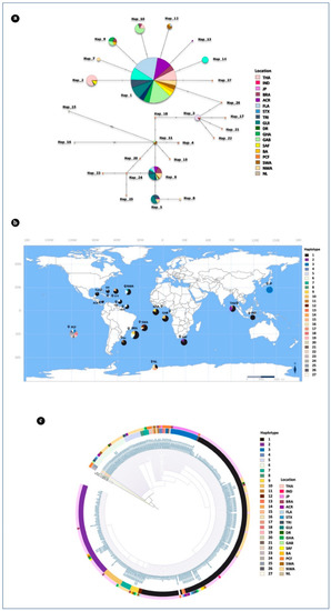 - Leigh, J.W.; Bryant, D. Popart: Full-feature software for haplotype network construction. Methods Ecol. Evol. 2015, 6, 1110–1116. [Google Scholar] [CrossRef]